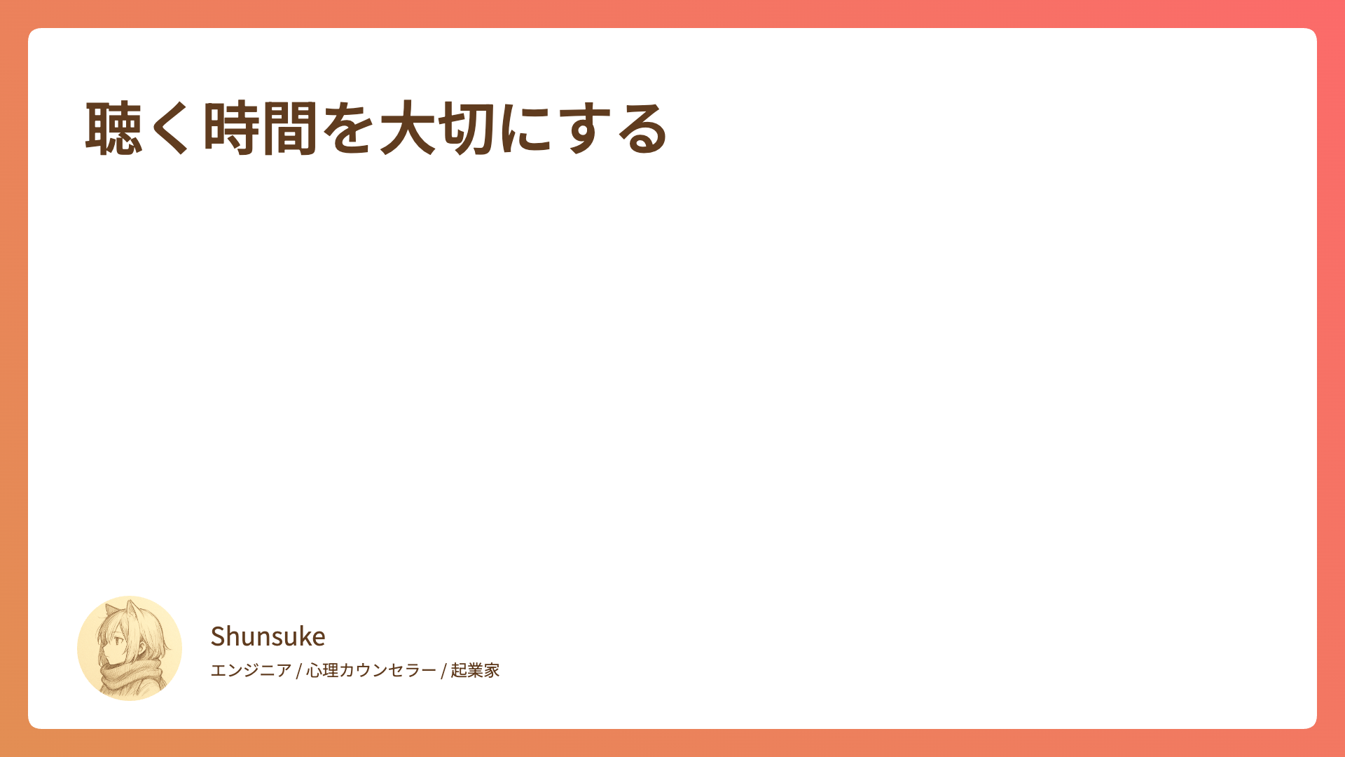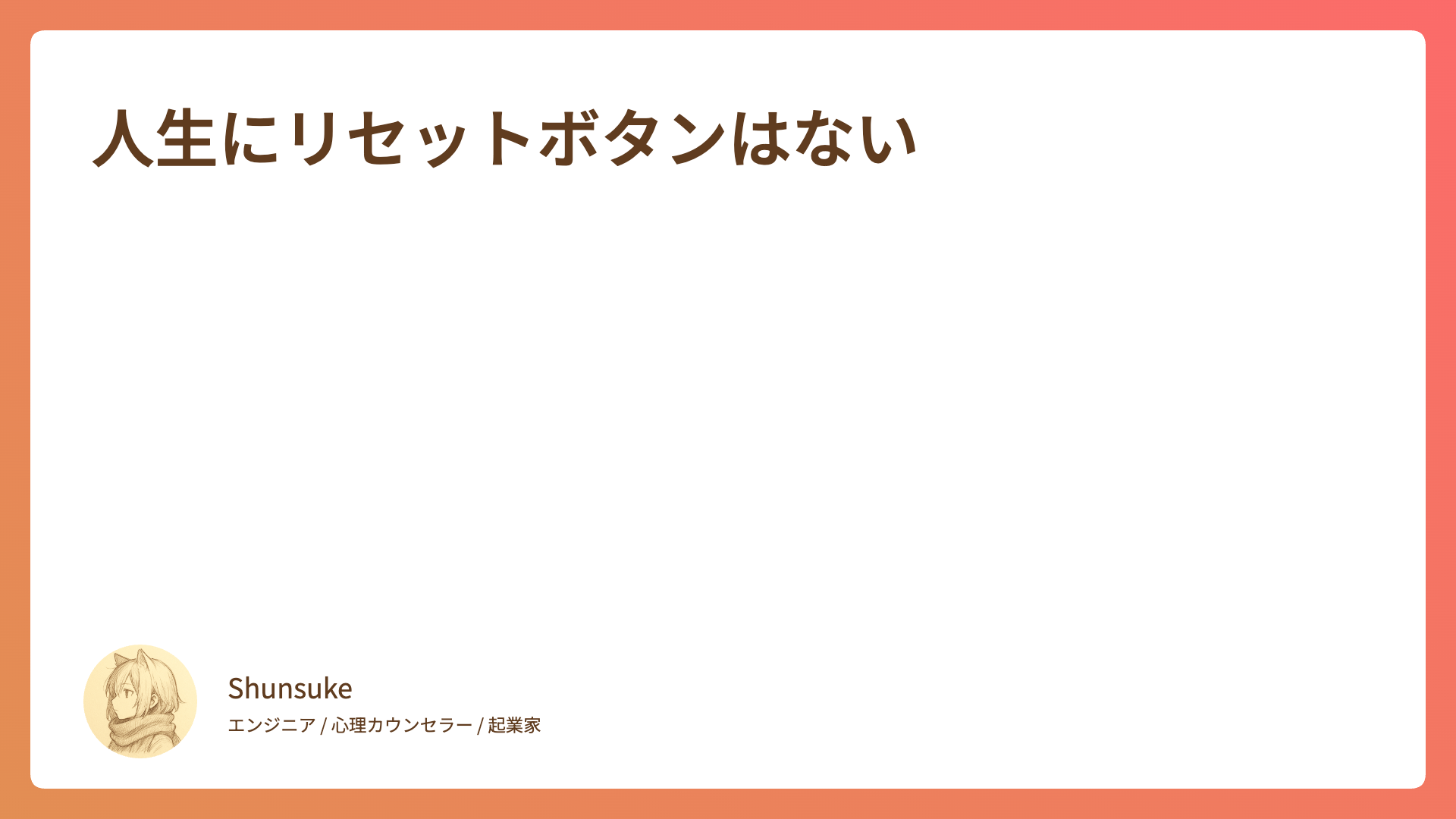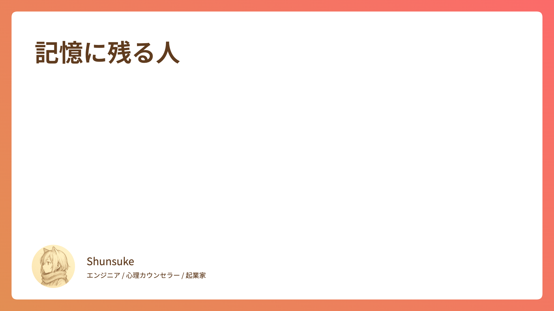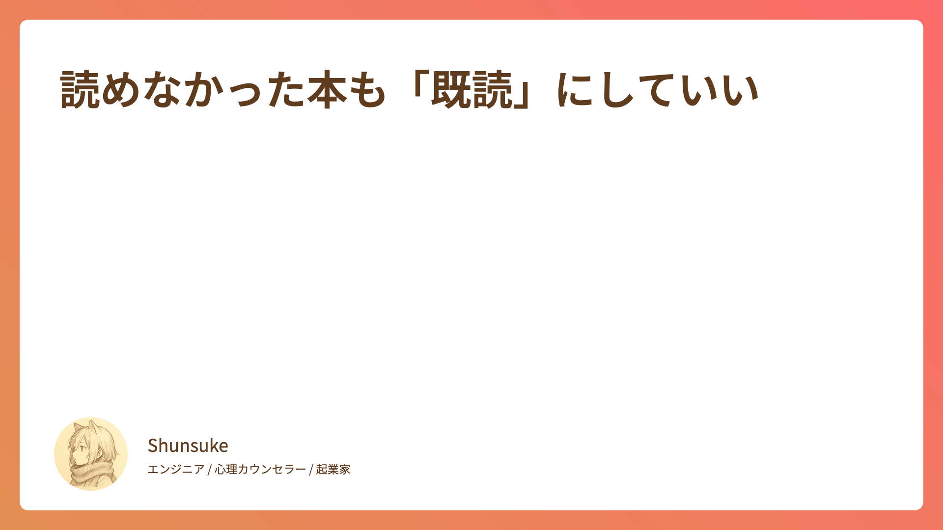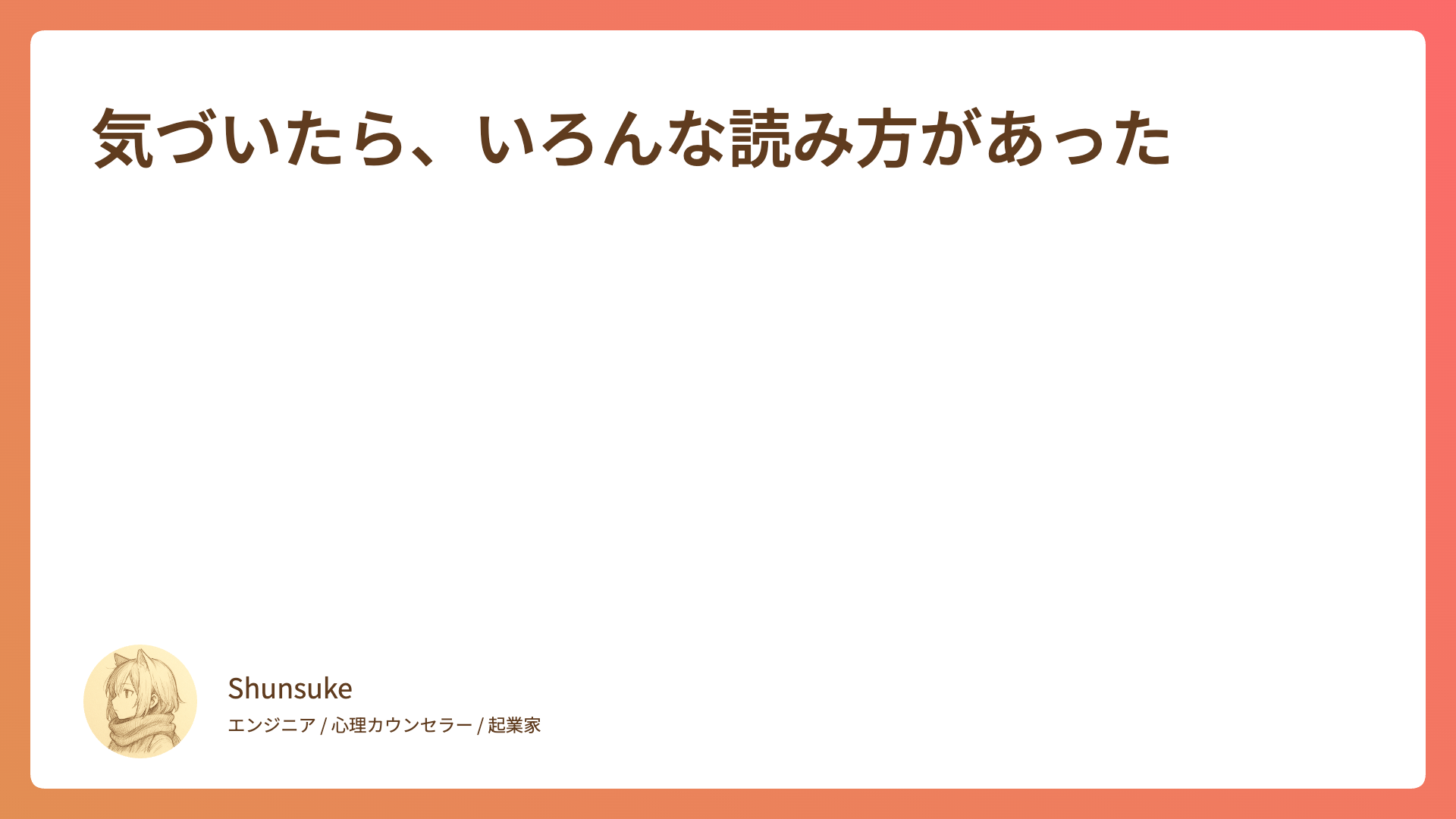 CATEGORY エッセイ 気づいたら、いろんな読み方があった 2026.01.09 エッセイ Shunsuke 心の落書き帳 人生にリセットボタンはない 2026.01.02 エッセイ Shunsuke 心の落書き帳 読めなかった本も「既読」にしていい 2025.12.26 エッセイ Shunsuke 心の落書き帳 聴く時間を大切にする 2025.12.16 エッセイ Shunsuke 心の落書き帳 記憶に残る人 2025.12.06 エッセイ Shunsuke 心の落書き帳 痛みの先にあるもの 2025.12.03 エッセイ Shunsuke 心の落書き帳 「自分の嫌い」は「誰かの好き」? 2025.11.29 エッセイ Shunsuke 心の落書き帳 「会いたいから会う」を取り戻す 2025.11.22 エッセイ Shunsuke 心の落書き帳 余裕のなさが他者の自由を奪う 2025.11.14 エッセイ Shunsuke 心の落書き帳 余計なことを言わない勇気 2025.11.07 エッセイ Shunsuke 心の落書き帳 もっと見る