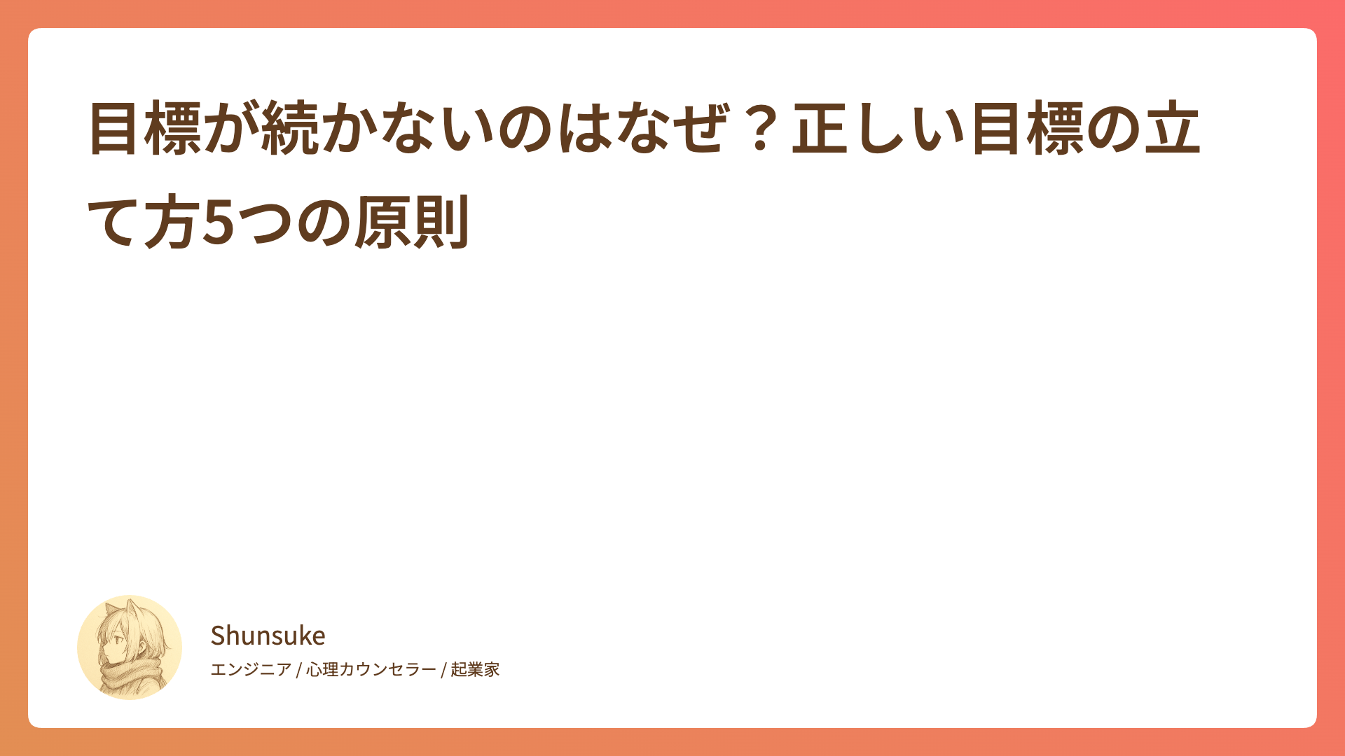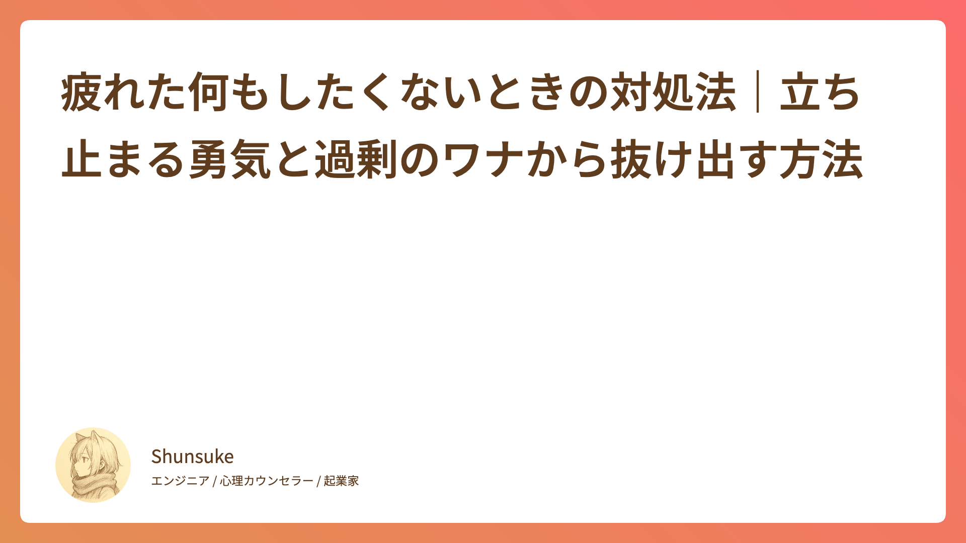 CATEGORY メンタルヘルス 自分で幸せになる方法|他人に委ねない生き方の始め方 2026.01.14 メンタルヘルス Shunsuke 心の落書き帳 予定を詰め込みすぎて疲れたあなたへ|心に余白を取り戻す方法 2026.01.12 メンタルヘルス Shunsuke 心の落書き帳 自慢話をやめたい|つい自慢してしまう心理と5つの改善方法 2026.01.08 メンタルヘルス Shunsuke 心の落書き帳 思い通りにならないときの対処法|変えられることと変えられないことを区別して心を軽くする 2026.01.07 メンタルヘルス Shunsuke 心の落書き帳 他人と比較してしまう癖をやめたい|昨日の自分と比較する成長の考え方 2026.01.05 メンタルヘルス Shunsuke 心の落書き帳 目標が続かないのはなぜ?正しい目標の立て方5つの原則 2026.01.04 メンタルヘルス Shunsuke 心の落書き帳 疲れた何もしたくないときの対処法|立ち止まる勇気と過剰のワナから抜け出す方法 2026.01.03 メンタルヘルス Shunsuke 心の落書き帳 お金で時間を買う選択|自分の時間の価値を見つめ直す方法 2026.01.01 メンタルヘルス Shunsuke 心の落書き帳 完璧主義をやめたい人のための「80点主義」実践ガイド|完璧主義 2025.12.31 メンタルヘルス Shunsuke 心の落書き帳 時間の作り方は「やめること」を決めるだけ|忙しさから抜け出す3つのステップ 2025.12.30 メンタルヘルス Shunsuke 心の落書き帳 もっと見る