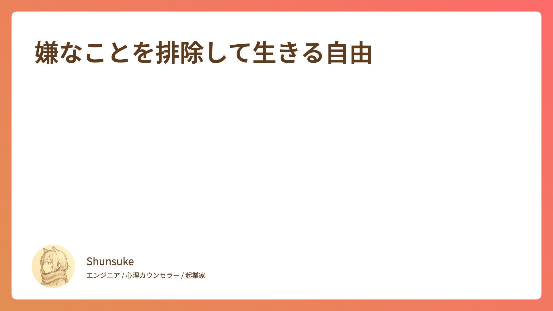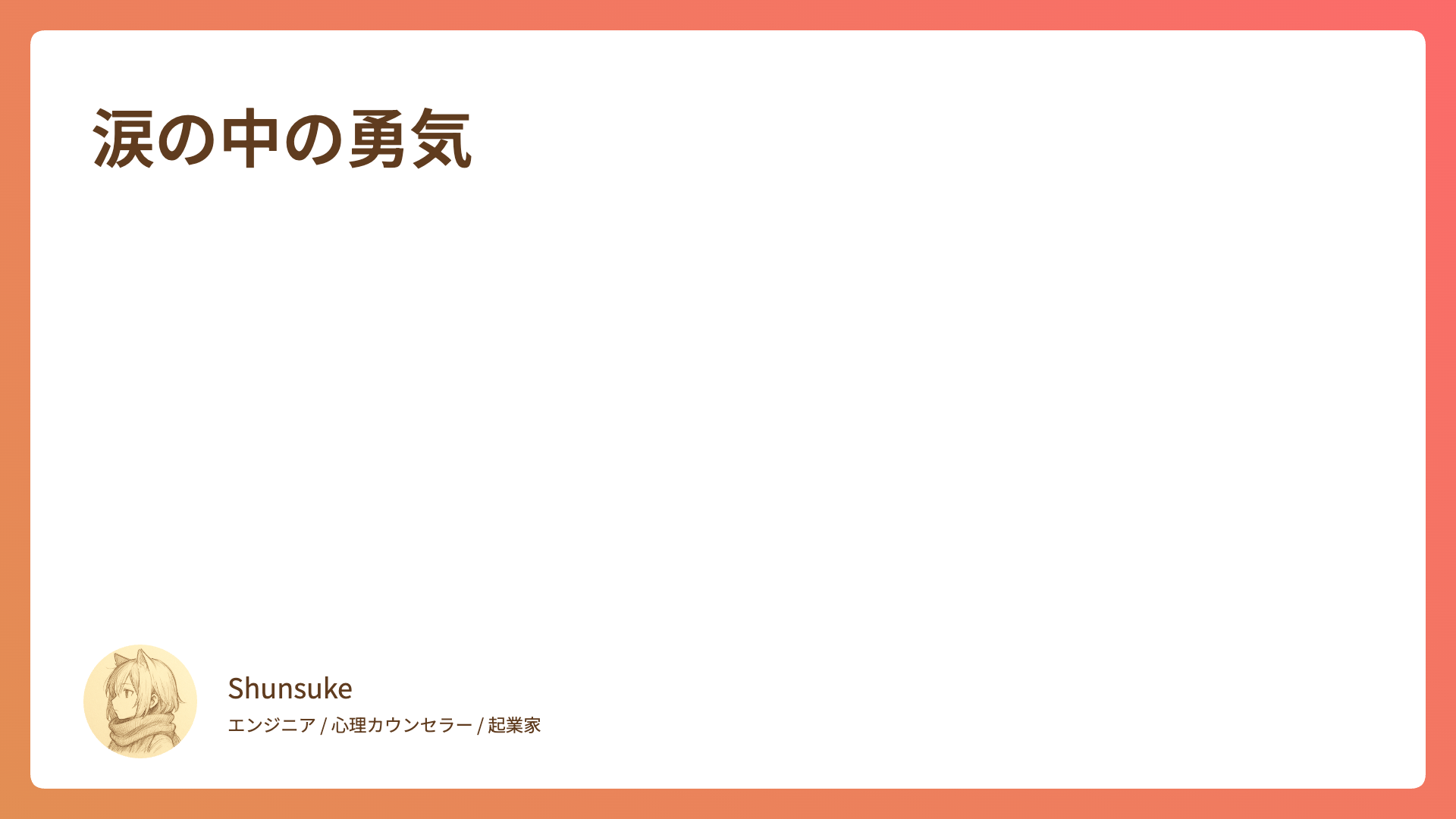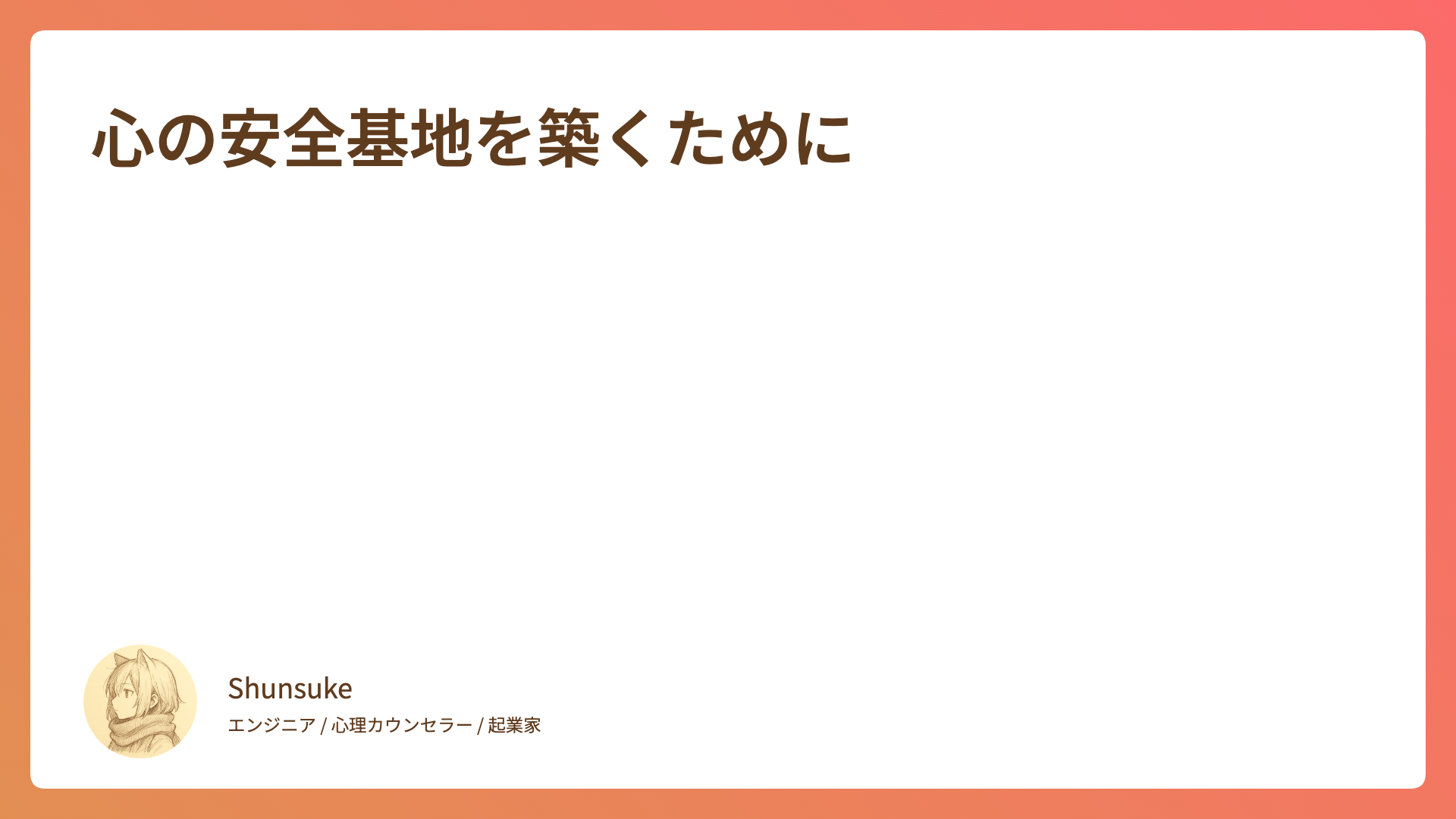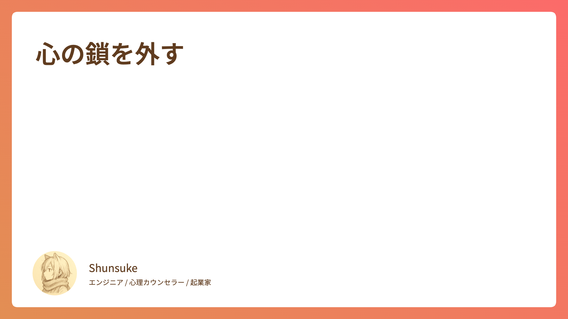 CATEGORY 連載 得意と不得意の向こうにあるもの 2025.09.11 連載 Shunsuke 心の落書き帳 想いが創る幻 2025.09.11 連載 Shunsuke 心の落書き帳 押し付けられた常識からの解放 2025.09.11 連載 Shunsuke 心の落書き帳 マニュアルのその先 2025.09.11 連載 Shunsuke 心の落書き帳 涙の中の勇気 2025.09.11 連載 Shunsuke 心の落書き帳 確実に成功する方法? 2025.09.11 連載 Shunsuke 心の落書き帳 母性と父性のバランス 2025.09.11 連載 Shunsuke 心の落書き帳 心の鎖を外す 2025.09.11 連載 Shunsuke 心の落書き帳 嫌なことを排除して生きる自由 2025.09.11 連載 Shunsuke 心の落書き帳 心の安全基地を築くために 2025.09.11 連載 Shunsuke 心の落書き帳 もっと見る