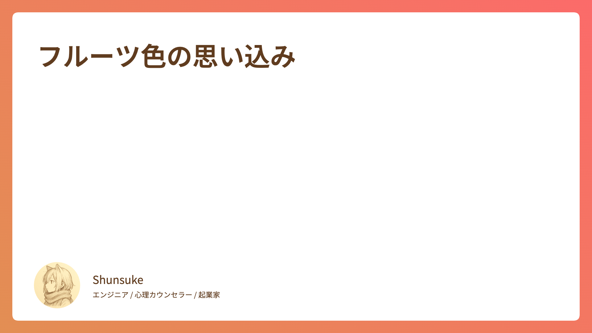 2025.09.11 連載 競争のない世界への招待状 Shunsuke こちらは、メンタルヘルスと自己成長をテーマにした連載です。全35回にわたって、日々の生活の中で感じる心の動きや人間関係について、心理学的な視点を交えながらお話ししていきます。 第2回〜第35回は有料コンテンツとなっています。(3,000円)一度ご購入いただければ、すべての記事をお読みいただけます。 まずは第1回の記事をご覧いただければと思います。 詳細はこちら支え合うための境界線 ここから先は限定公開です この続きの文字数: 「2421文字」 続きを見る3000円 すでに購入済みの方はこちら #メンタルヘルス#自己成長 ABOUT ME Shunsukeエンジニア / 心理カウンセラー / 起業家ひとりの未熟な人間として、現時点での思考を静かに書き残しています。 正しさよりも、気づきや安心を大切にしたい。 誰かの心が少しでもやわらぐ言葉を残せたらと思っています。 noteにも書いています。 https://note.com/shunsuke0112